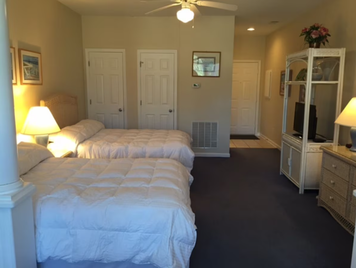 Our deluxe two bedroom villas feature two full-size beds in each room and two spacious bathrooms. Villa offers a living room with a separate dining area, a fully equipped kitchen, washer, and dryer, plus a porch overlooking the resort’s natural surroundings. Mini-villa also features a microwave oven, toaster, refrigerator, sink, and seated eating nook.